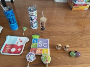 Lab-themed door prizes, science cupcake toppers, paper products, stress balls, and science lollipops that were in the goody bags for the career fair.